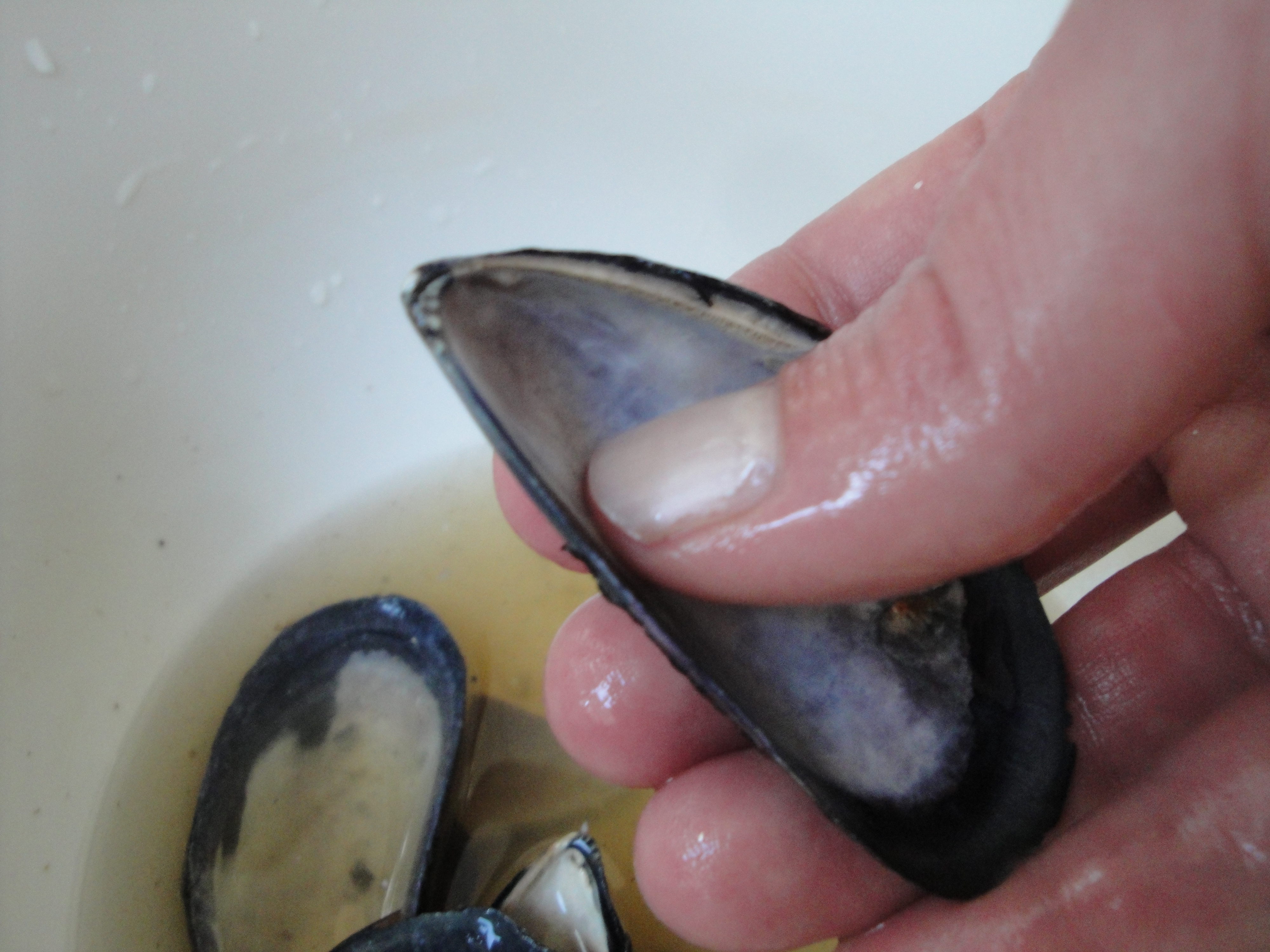 1. Rinse your mussel shells using a mixture of vinegar and water (I used 1/4 cup vinegar to 1/2 cup water, I don’t think the proportion matters too much). For ones that had a little more crust, I used my thumb to polish it.