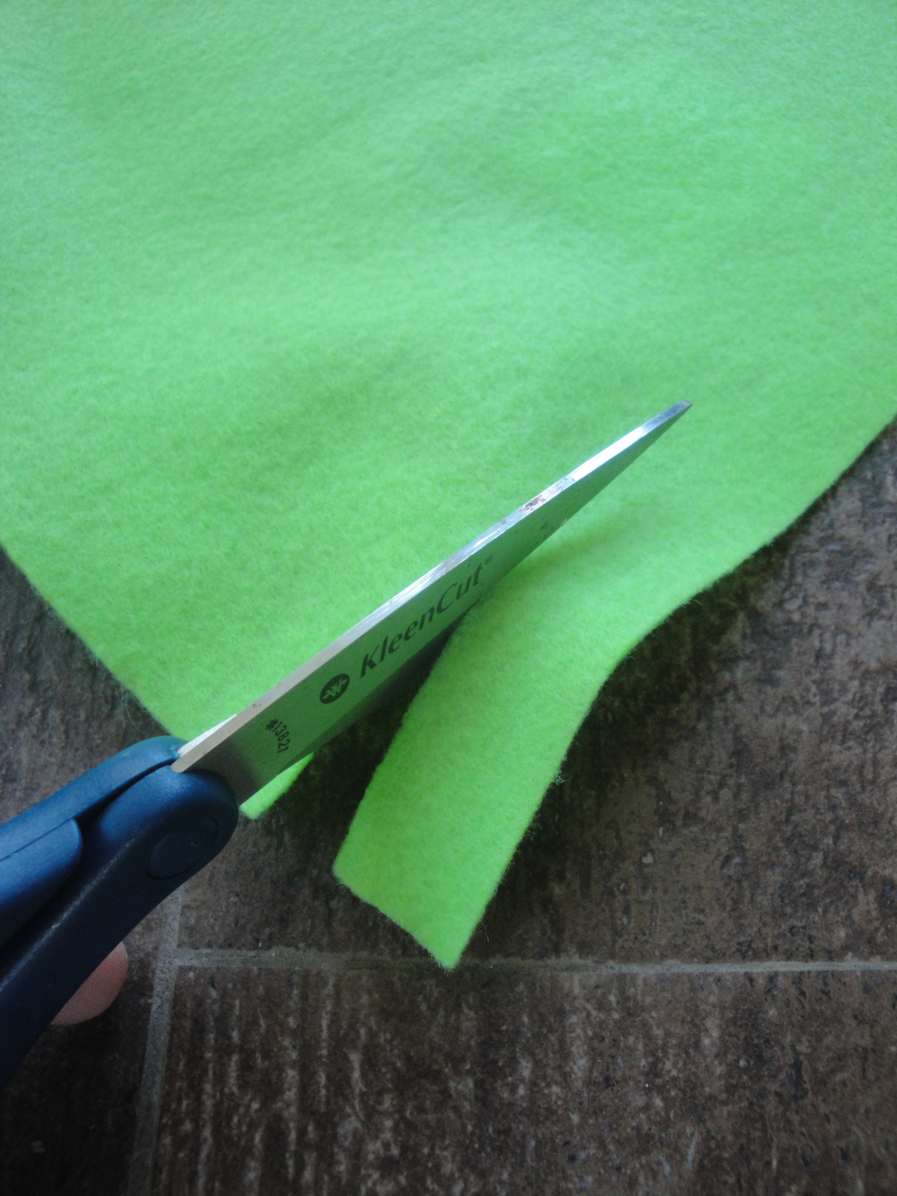 Cut each piece of felt horizontally into about 12 strips, about 1″ wide each (it doesn’t need to be perfect).