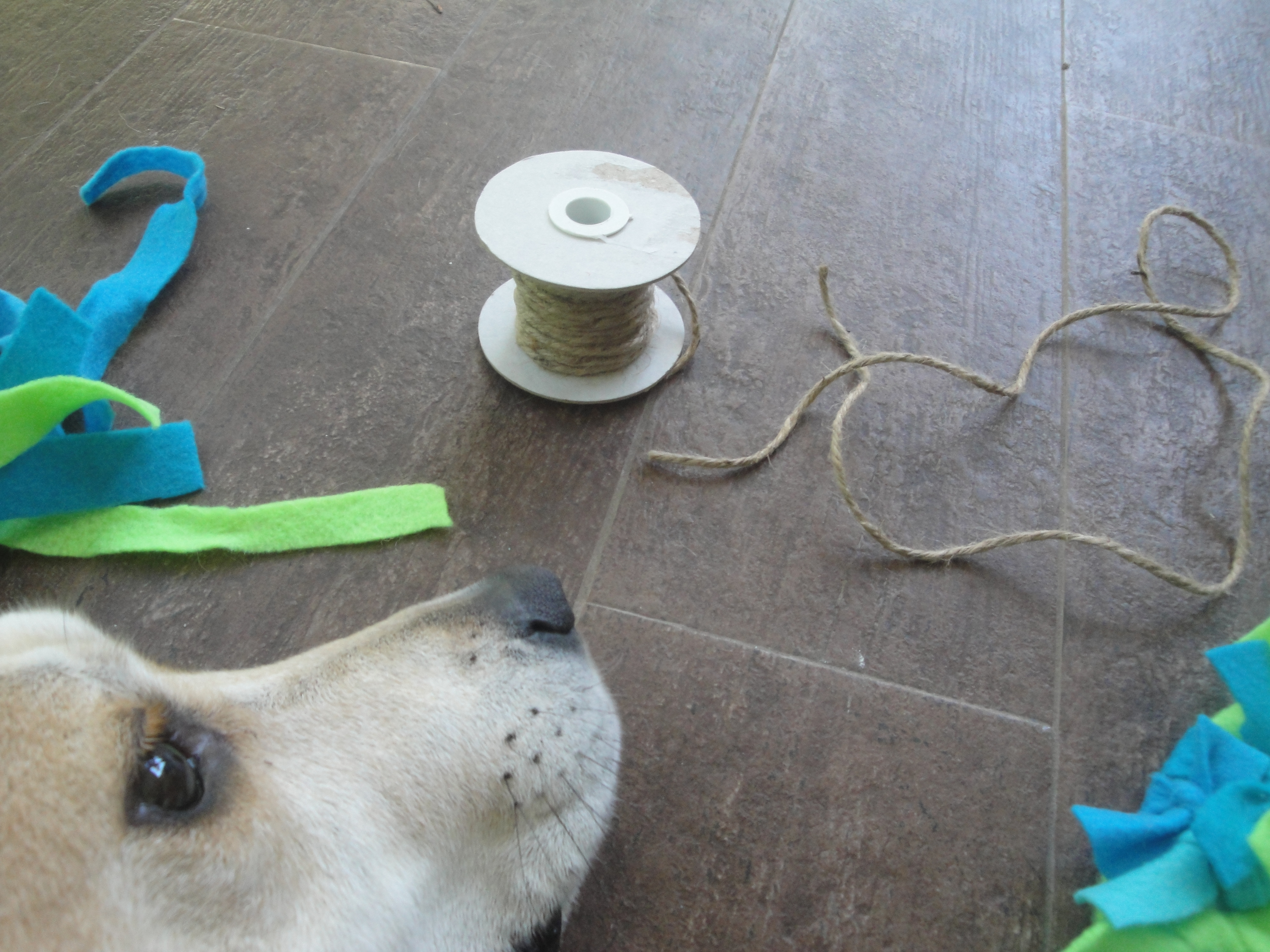 Cut a piece of twine about 15-18 inches long and tie it in a bow around the top of the wreath. (It was here that our sweet pup decided we could use his help. So thoughtful! 🙂 )
