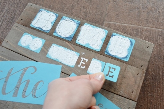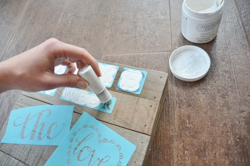 2. Use the foam pouncer to dab on paint over the stencils (the less runny the paint, the better — you can leave some on the lid to dry up a little if needed). You’ll need to carefully remove the “E” stencil, rinse it, and re-position it: