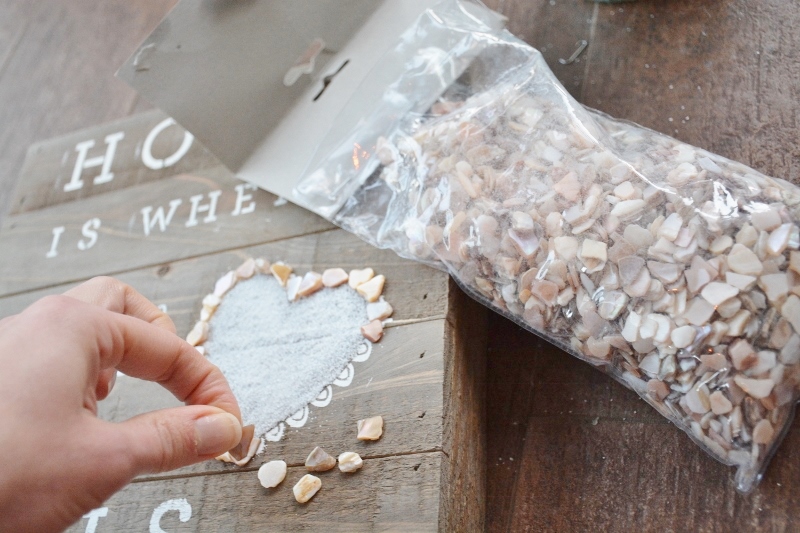 6. Once the inside of the heart is dry, hot glue pieces of broken seashells around the border of the heart (careful of your fingers!)…
