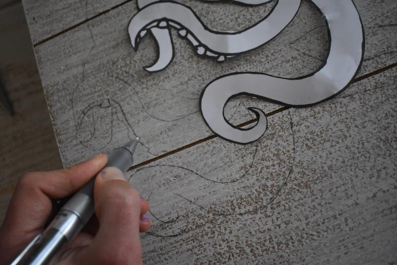 4. Once the paint splattering is dry (you may need to leave it for a little while), place the octopus stencil on the wood sign and then trace it. Add the eye, tentacles, and any lines that need to be filled in:
