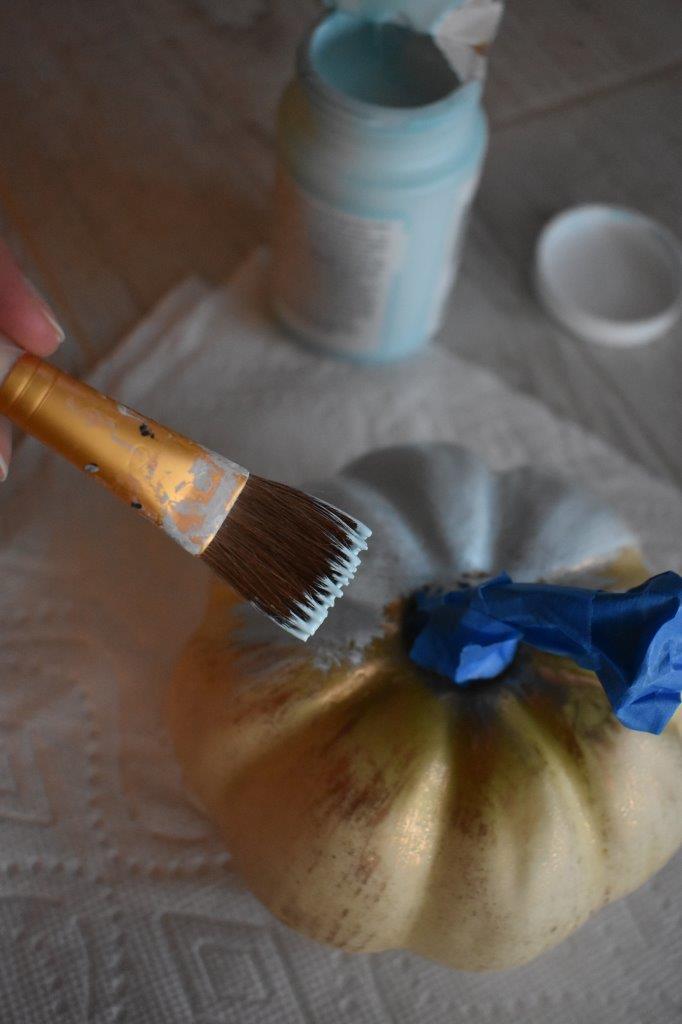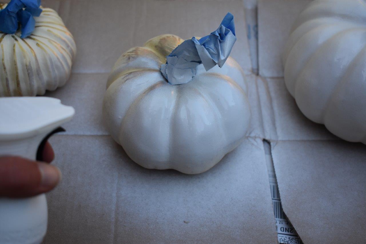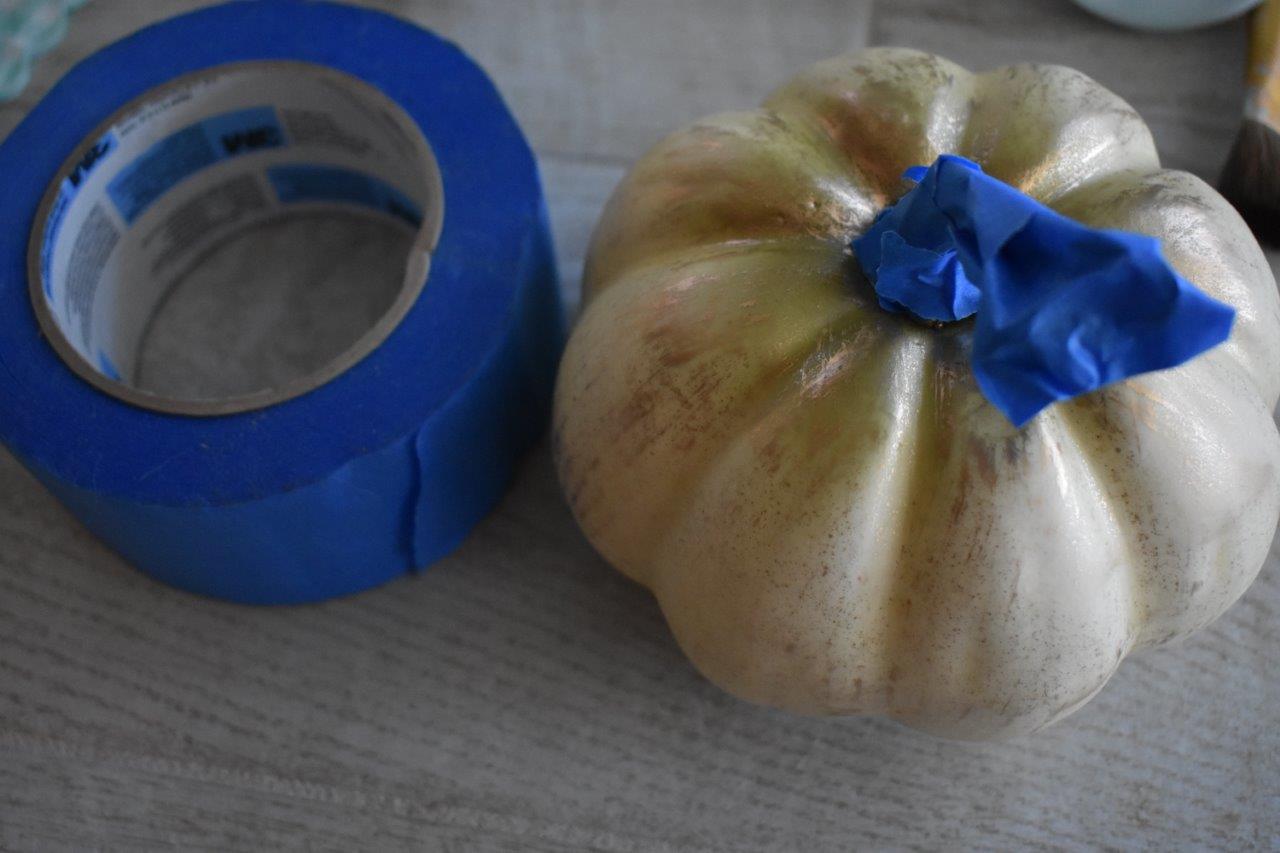 We spray painted some of them white, and one of them with chalky blue paint. You’ll want to wrap the stems with painter’s tape: