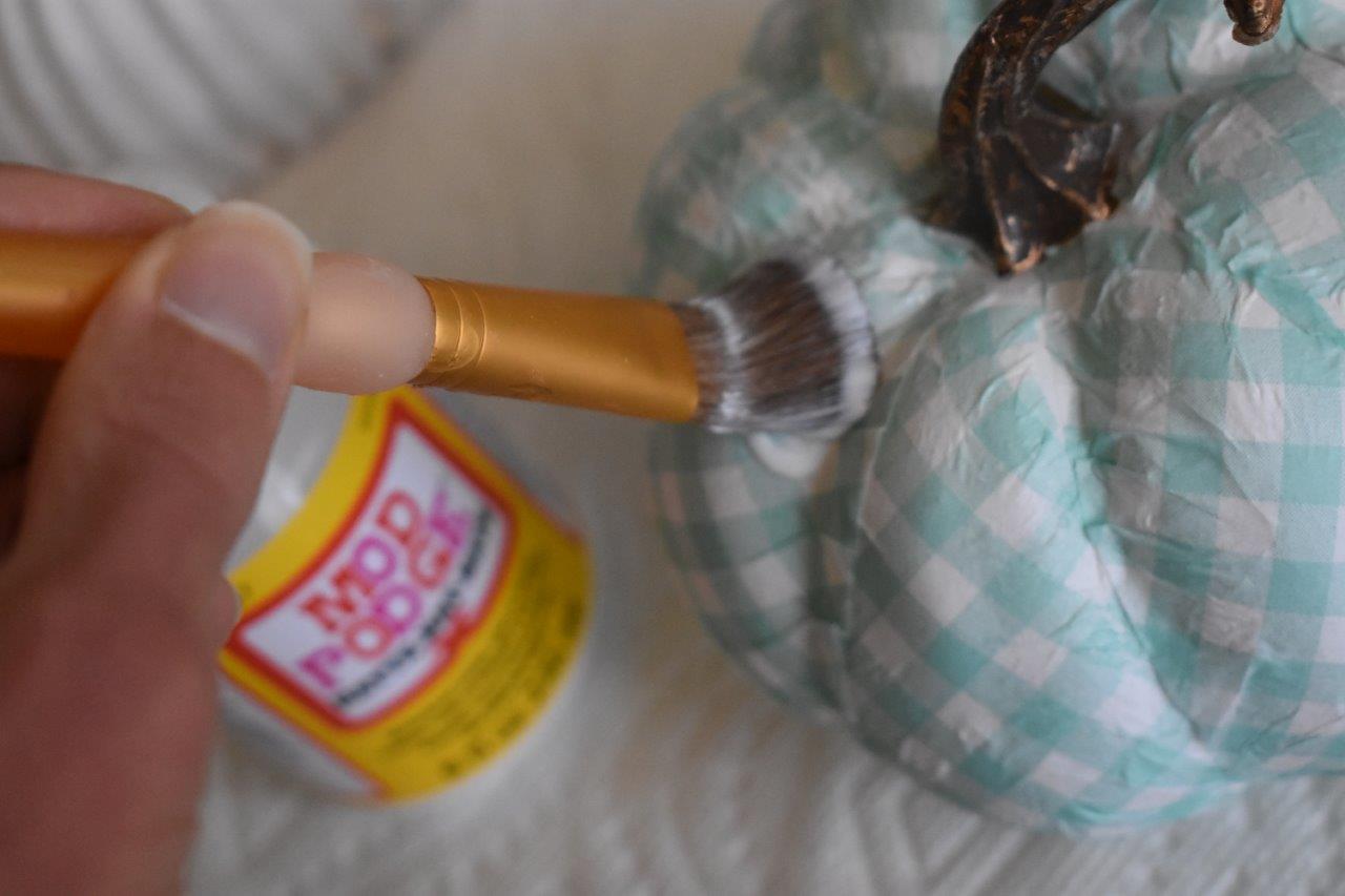 The thin napkins will show the color of the pumpkin underneath, so you may want to paint your pumpkins first! (It depends on the pattern/color of the napkins, so you may not need to…look for white ones to save some time!)