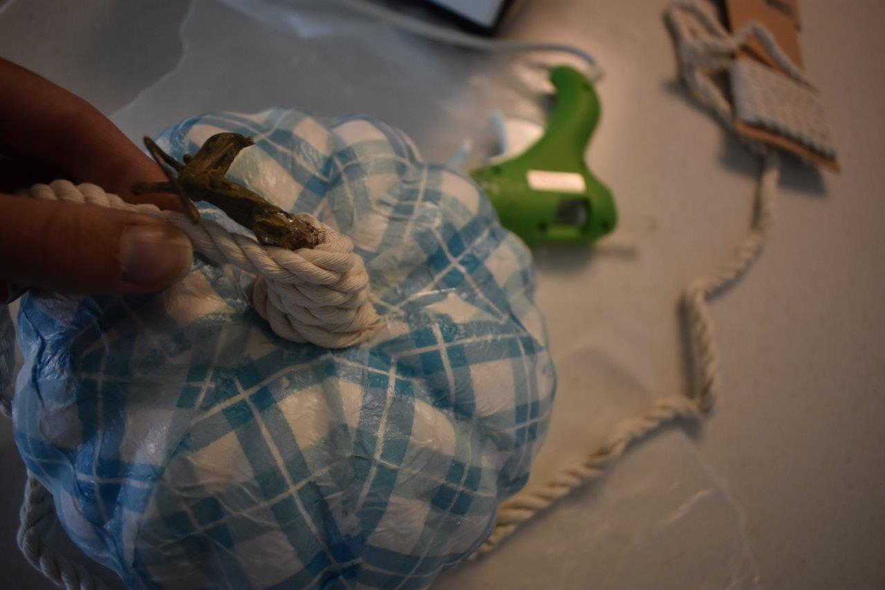 Cut the rope into pieces that are the length of the pumpkin sections, as many as you decide you need for each pumpkin. Hot glue each of them on one-by-one. You can also wrap the rope around the stem, hot-gluing as you go: